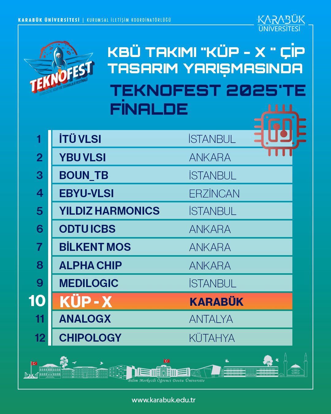 Karabük Üniversitesi (KBÜ) öğrencilerinden oluşan KÜP-X Takımı, TEKNOFEST 2025 kapsamında düzenlenen Çip Tasarım Yarışması’nda ‘Detay Tasarım Raporu’ değerlendirmelerini başarıyla tamamlayarak final etabına yükseldi.