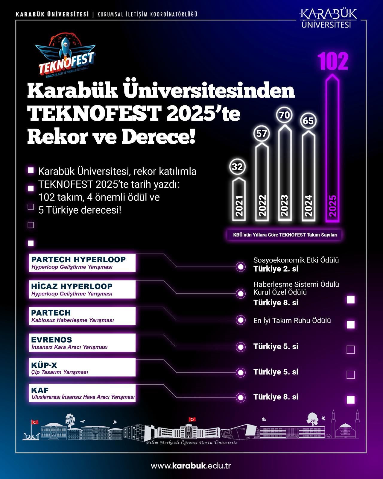 Karabük Üniversitesinin TEKNOFEST’e katılımı her yıl düzenli bir artış gösterdi. 2025’te başvuru yapan takım sayısı bir önceki yıla göre %57 oranında yükselerek 102’ye ulaştı ve üniversite için yeni bir rekor oldu. Ön eleme aşamasını geçen ekip sayısı da geçen yıla göre %29 artış göstererek 53’e çıktı. Bu süreçte Karabük Üniversitesi takımları, farklı kategorilerde elde ettikleri derecelerle de ilk kez ulusal ölçekte başarı elde etti.